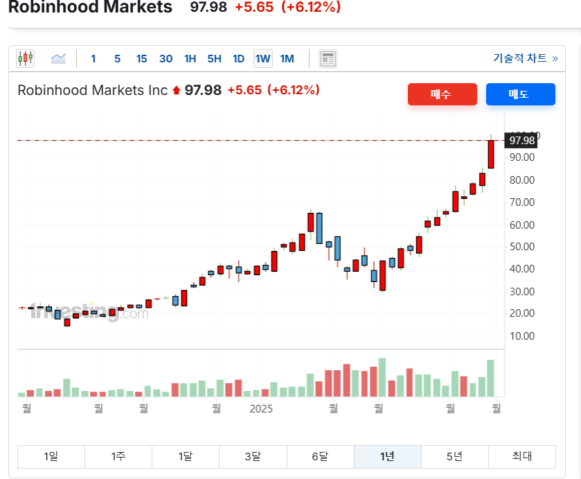 A. 2025년 7월 3일 기준, 로빈훗 마켓츠(HOOD)의 주가는 $97.98입니다. 최근 몇 달간 상승세를 보이며 시장의 주목을 받고 있습니다.